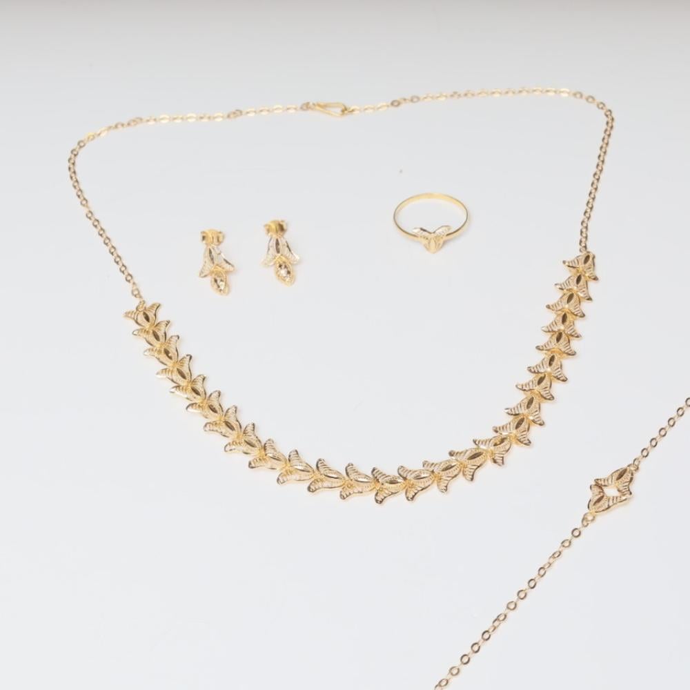21 karat set, ring + necklace + bracelet earrings, suitable for weddings and engagements. It adds beauty to me.